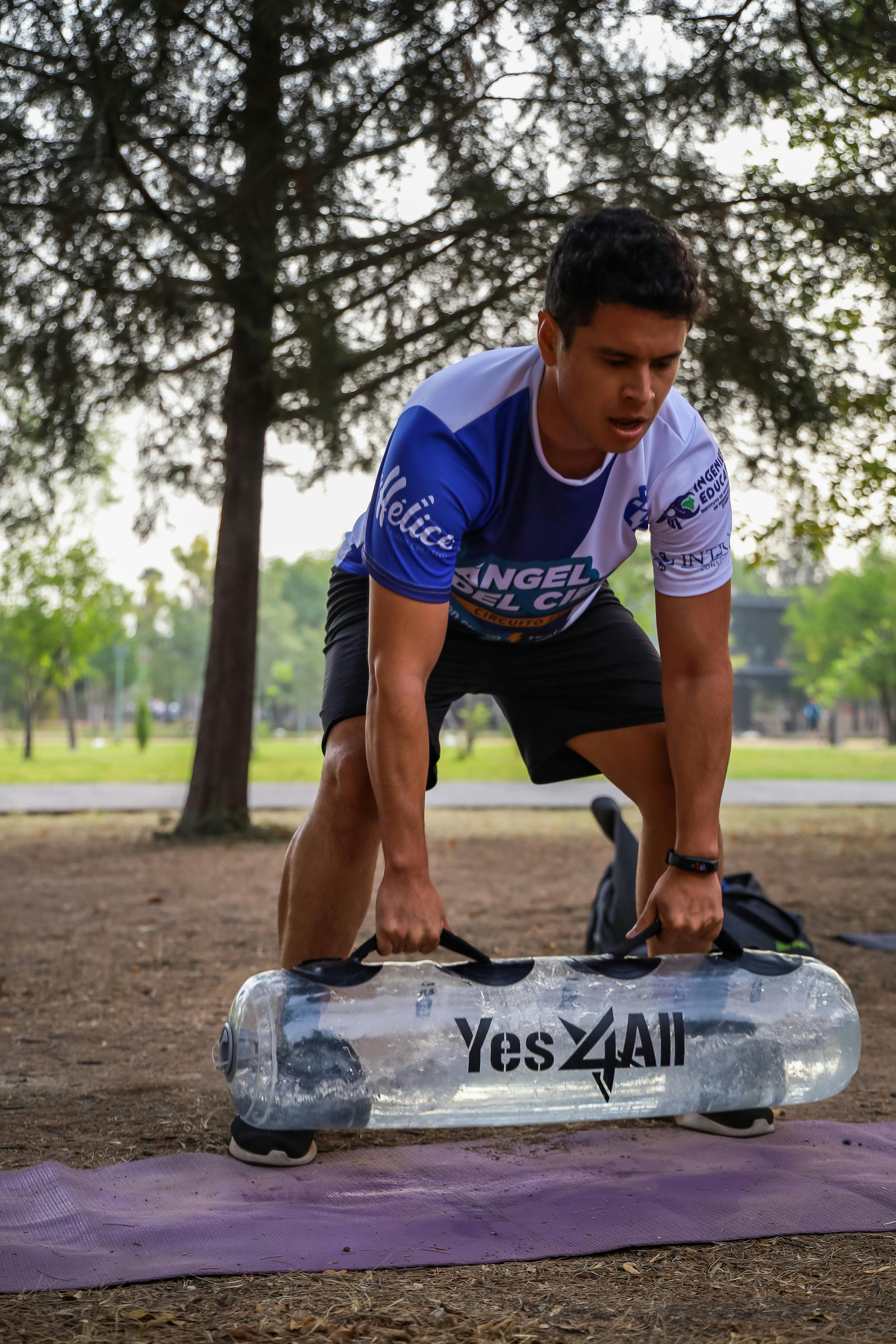 Sportsman Doing Lifting Aqua bag Exercise in Park